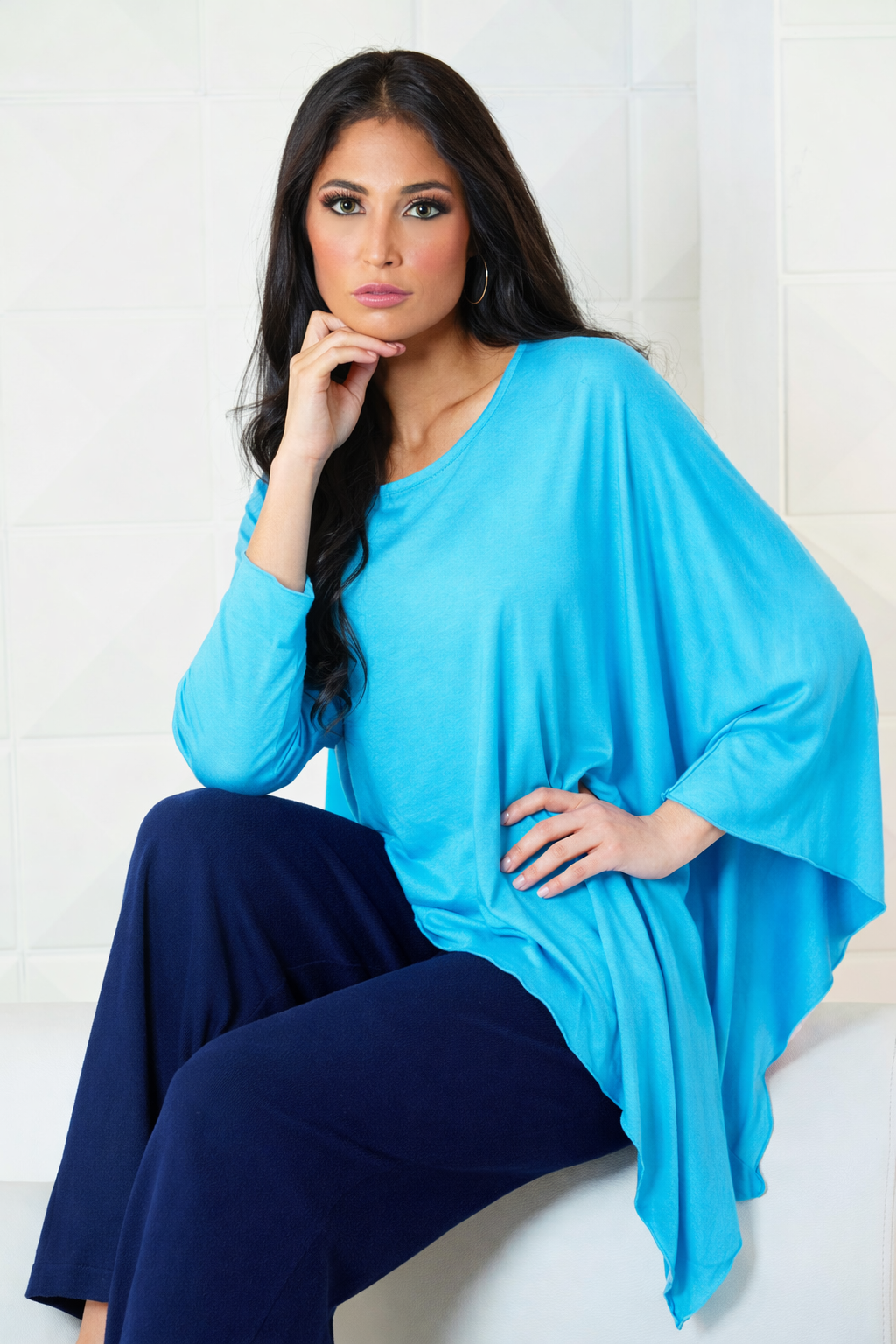 When your fashion needs call for a little extra drama, this asymmetrical tunic from ANGEL is the right way to amp things up. Its hem is longer on one side with a batwing sleeve so you can tie it up or let it flow freely.
