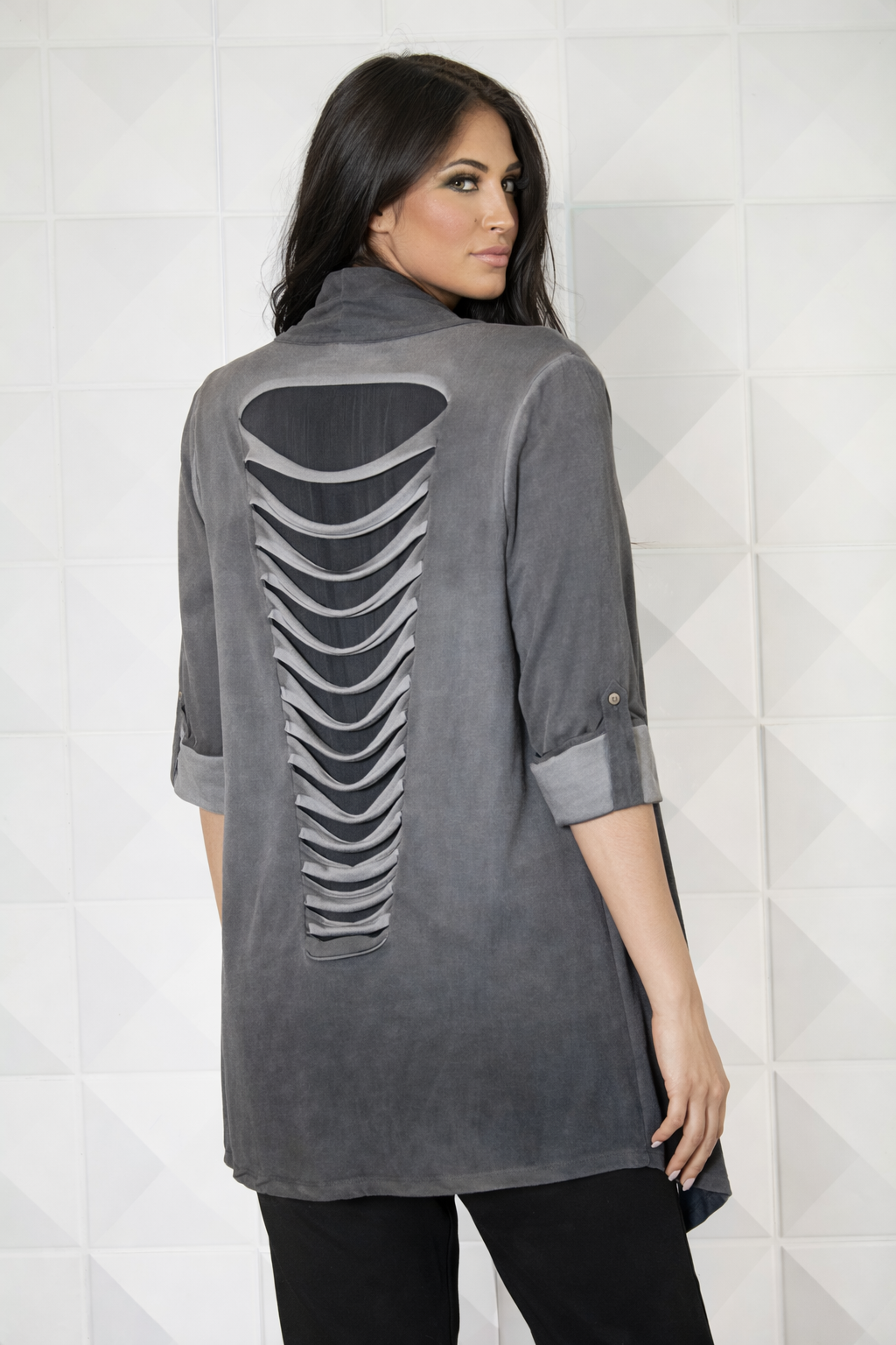 A beloved basic becomes so much more with a dual, head-turning design. In the front, this ANGEL cardigan shows off a great drape while a slashed panel in the back gives the look a little extra attitude.