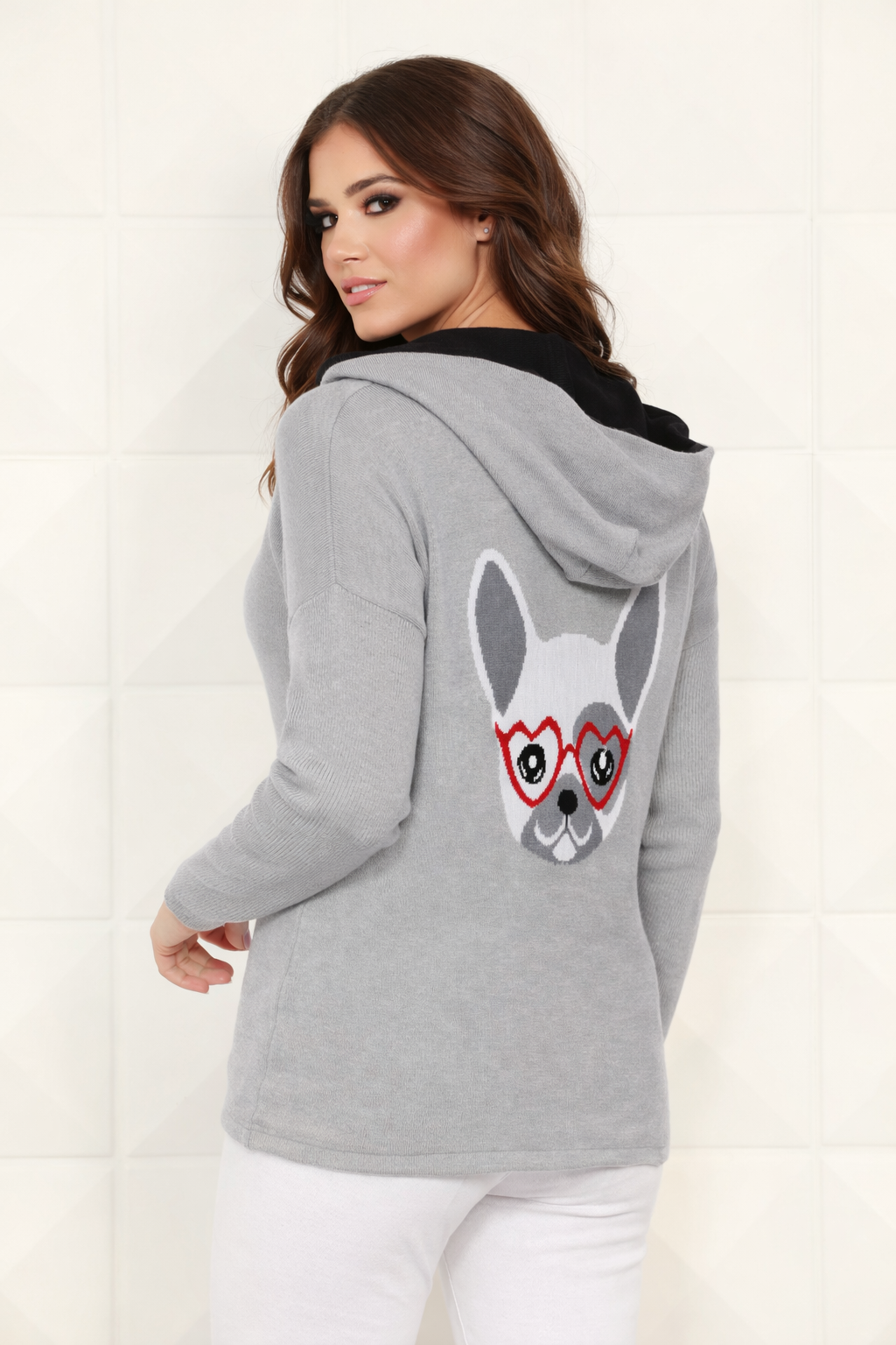 High fashion meets playful graphic with this Hooded Cardigan. ANGEL takes an ordinary cardigan and kicks it up a notch with a bound zipper and adorable Frenchie on the back.