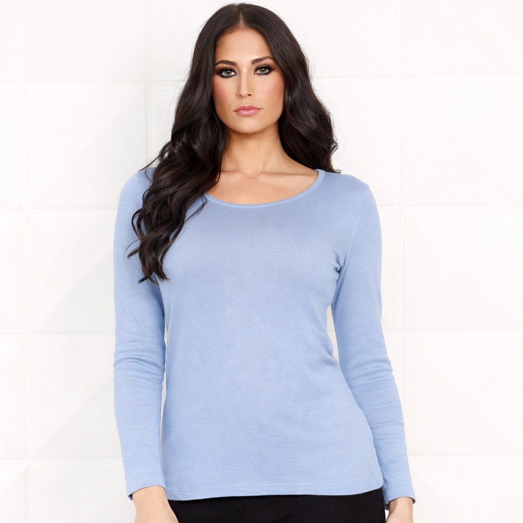 A scoop neckline gives you a face-flattering, open look while maintaining the coverage you want. This long-sleeve shirt is a comfortable layering piece you'll want to pair with your most beloved ANGEL designs!