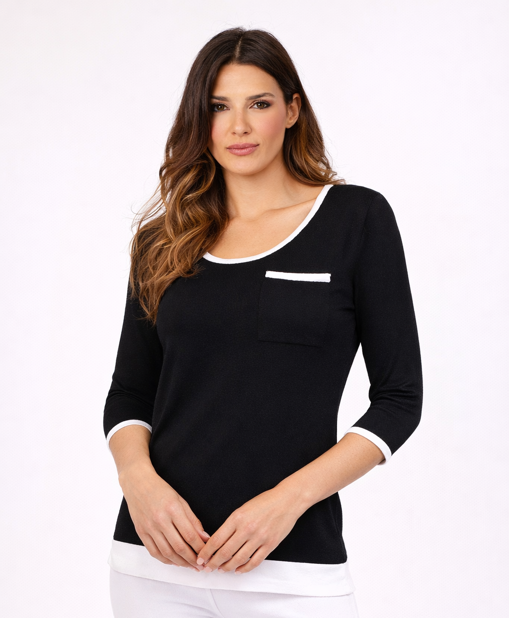 ANGEL gives a versatile pullover a fashion-forward twist. With color-blocked trim at the collar, pocket, cuffs and hem and a sleek buttoned placket in back, this top proves basics can be anything but.