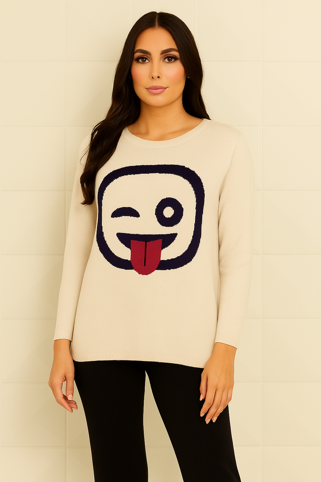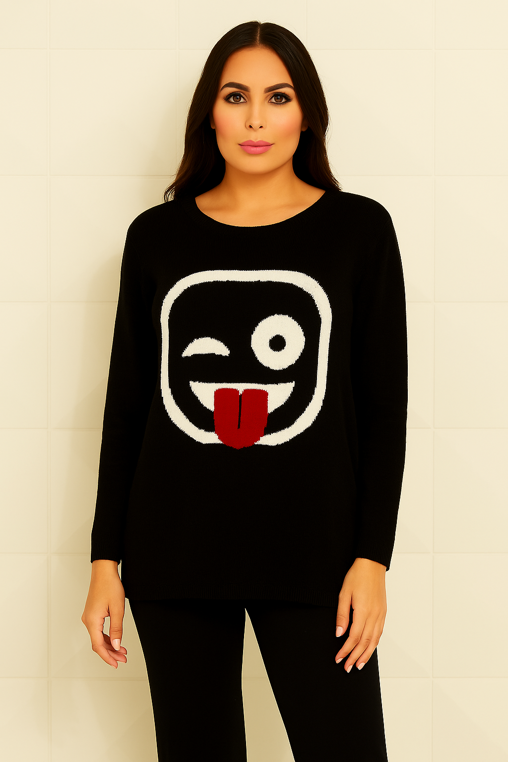 ¿Te sientes un poco travieso? Comparte tus emojis favoritos con el mundo: este suéter de ANGEL toma un concepto conmovedor y lo traduce en un look alegre y de alta costura.