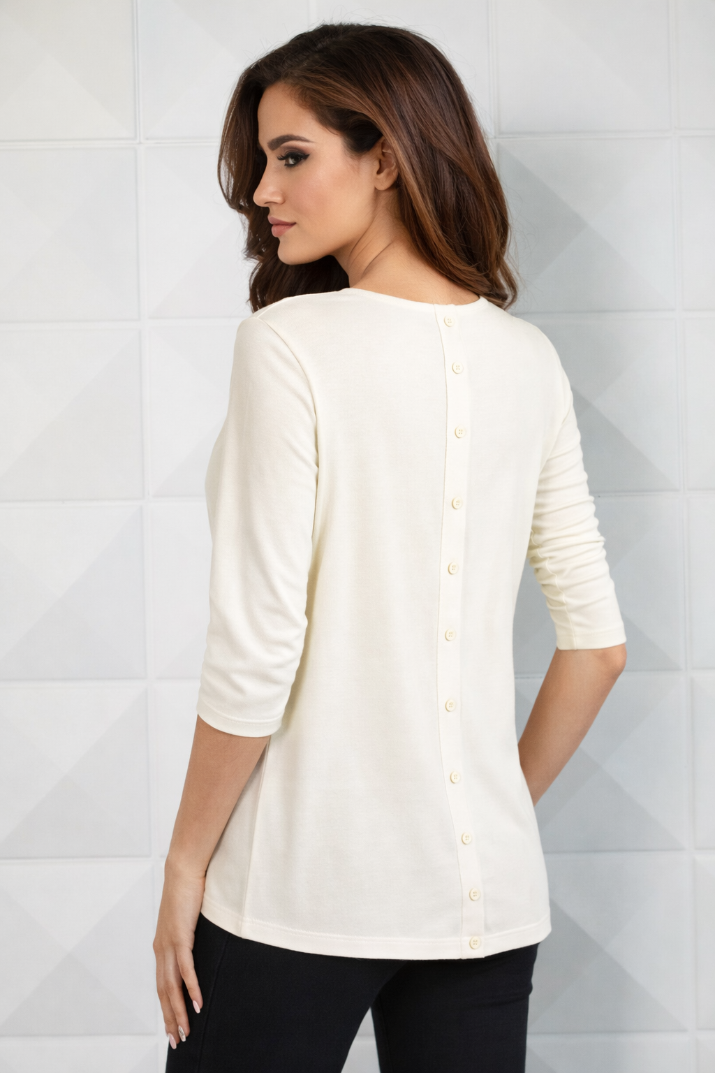 A veces todo lo que tienes que hacer es mirar las cosas desde un ángulo diferente. Con un escote redondo en la parte delantera, este top ANGEL es un básico esencial, pero dale la vuelta y los botones en la parte posterior le dan una sensibilidad de diseño moderno.